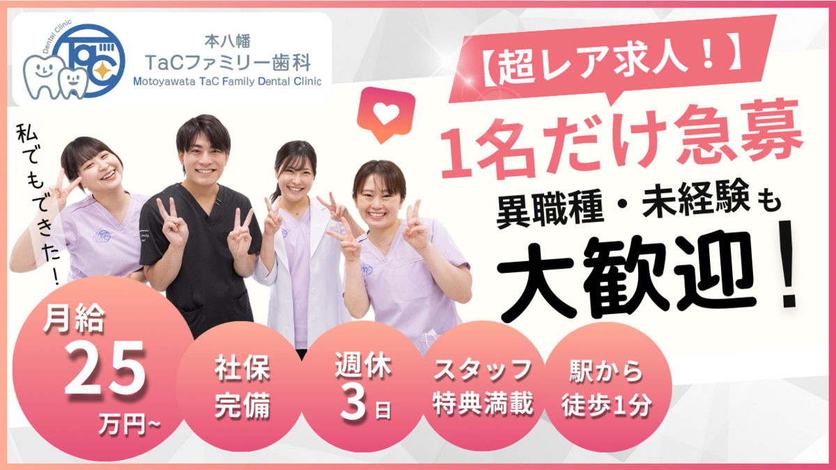 本八幡TaCファミリー歯科は、本八幡駅南口から徒歩1分、MEGAドン・キホーテ内にある通いやすい歯科クリニックです。平日夜21時まで、土日も診療を行い、忙しい方にも対応。痛みを抑えた治療や徹底した感染対策、小児から高齢者まで幅広い診療に対応し、ご家族で通える「かかりつけ歯科」として地域に根差した医療を提供しています。